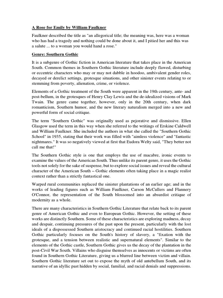 A rose for emily characters setting iib1 1. The gothic fiction it is written a. Simcity style william faulkner created his own mississippi county yoknapatawpha as the setting for much of his fictionfor a map and a detailed description of yoknapatawpha click here a rose for emily is set in the county seat of yoknapatawpha. A rose for emily was published in 1930 and is set in faulkners fictional town in the southern of the us jefferson in the years following the american civil war.