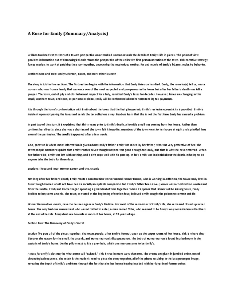 If you need an original summary of a rose for emily or a paper on a different topic feel free to place your order. A rose for emily by william faulkner is one of the classics penned down in 1930. Summary of a rose for emily section 1. An unnamed narrator who seems to be speaking on behalf of the group tells us that when miss emily grierson died the whole town attended her funeral.