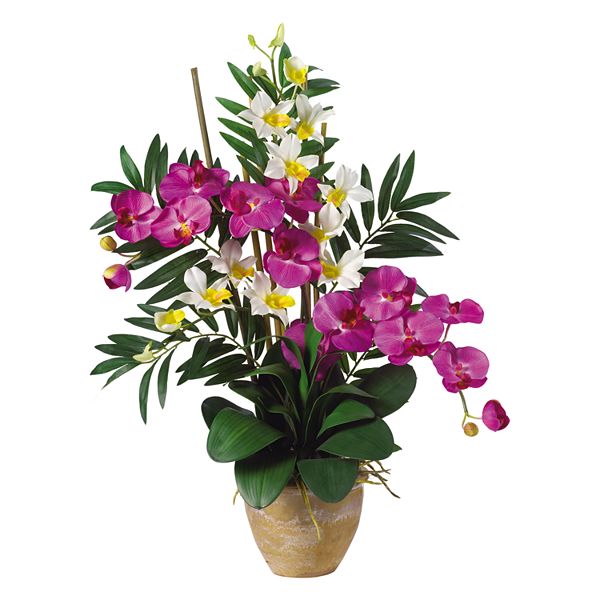 Artificial orchid arrangement. See for yourself what their delicate shapes and vibrant colors can do to enhance the decor of any room. Add a touch of exotic beauty and texture to your home and office decor with our handcrafted silk orchid arrangements. Designed for use in artificial floral or greenery arrangements. We offer these attractive plants in a myriad of colors including white peach red and rust to match the decor of your home or office.