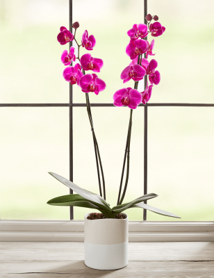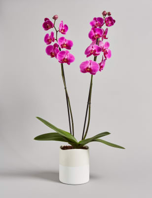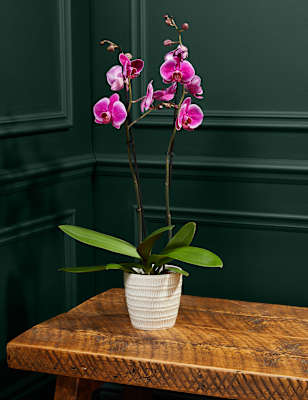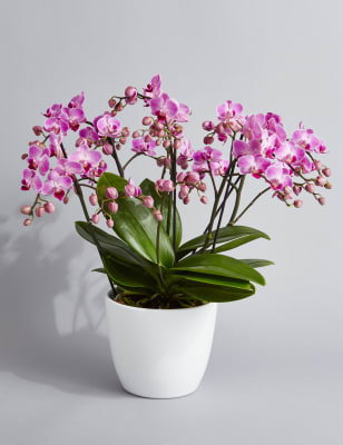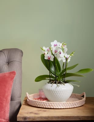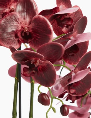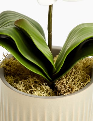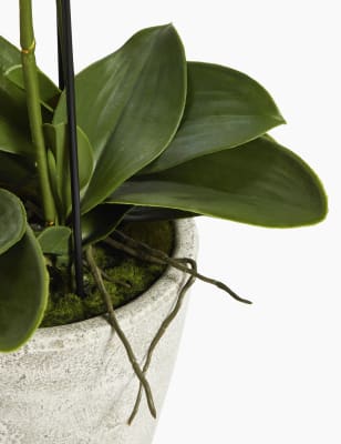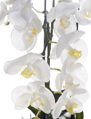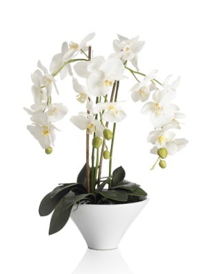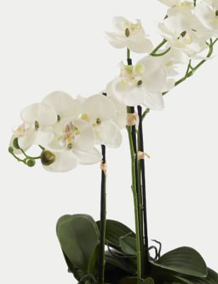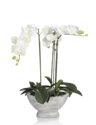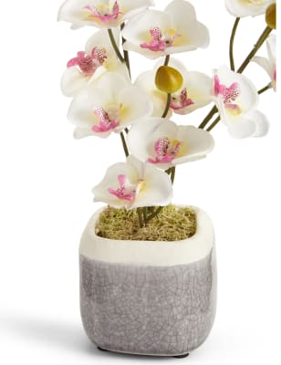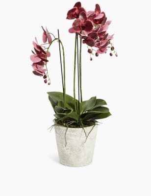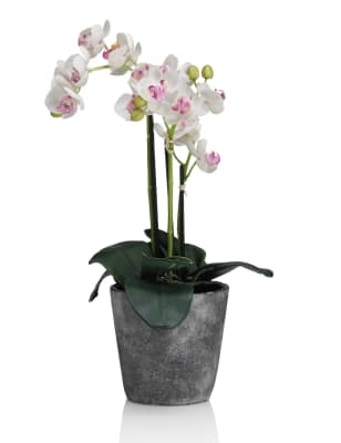 These blooms and botanicals will always look fresh shop the floral collection at ms. Each artificial orchid plant is handcrafted by skilled artisans with each leaf carefully cut from a silk polyester blend and uv treated to ensure botanical accuracy and lasting colour. Artificial orchid ochre in grey pot 56cm. From small to large artificial orchids in pots there is a range of decorative pots from chrome to matt black that is sure to add to this elegant style.