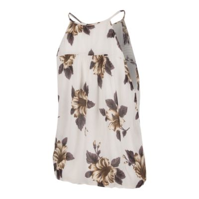 Oneill womens woven tank 17 12 in length front button closure over the shoulder straps with adjusters fitted upper panel with flowy lower cropped design allover print metal logo badge 100 c. The oneill trippin grey sunflower tank top perfectly captures the spirit of a summer road trip with friends. You will love its cropped design and fun floral print. Soft cotton tank top.