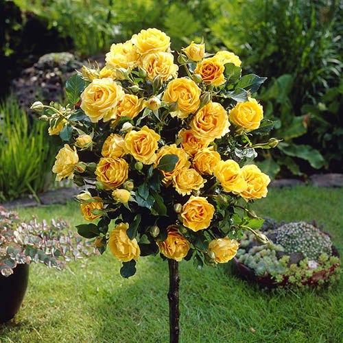 Standard rose trees. Plant them for example in a square border edged with boxwood. Standard tree roses are magnificent garden plants. Golden memories 14 standard rose. Alecs red 12 standard rose 3499.
