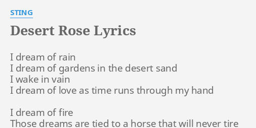 I dream of rain i dream of gardens in the desert sand i wake in pain i dream of love as time runs through my hand i dream of fire those dre. Brand new day 1999 i dream of rain i dream of gardens in the desert sand i wake in pain i dream of love as time runs through my hand i dream of fire those dreams are tied to a horse that will never tire and in the flames her shadows play in the shape of a mans desire. Sting desert rose lyrics. Desert rose my songs version lyrics.