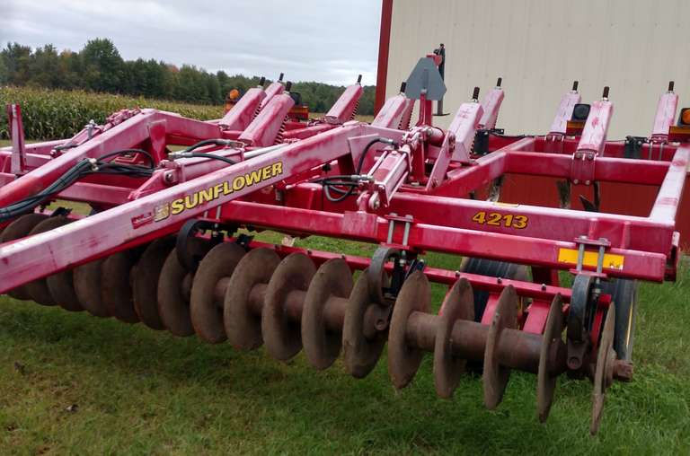Sunflower 4213. Hydraulically adjusted coulter gangs effectively size and cut residue to eliminate plugging and the need for shredding or discing before ripping. With coulters spaced every 75 inches shanks on 15 inch centers and sizes beginning at seven shanks the 4213 fits well in smaller farming operations. The sunflower 4213 coulter chisel can completely fracture hardpans and eliminate soil compaction to a depth of 12 inches that a wider spaced shank arrangement would miss. Inventory unit detail clinton tractor implement co.