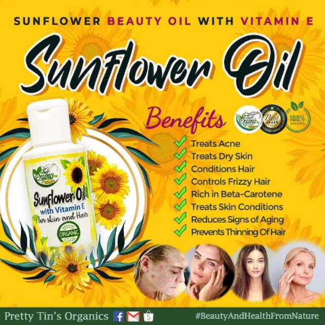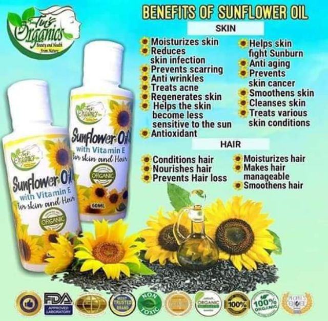 Sunflower oil for hair. Sunflower oil acts as a natural moisturizer because its unfused with several vitamins and minerals including high levels of vitamin e that produces healthy hair growth. Also sunflower seed oil for hair acts amazingly in locking in moisture keeping strands healthy. Below are a few sunflower oil benefits. However dont be surprised to know that sunflower oil is largely used as base oils in various hair oilstoo.